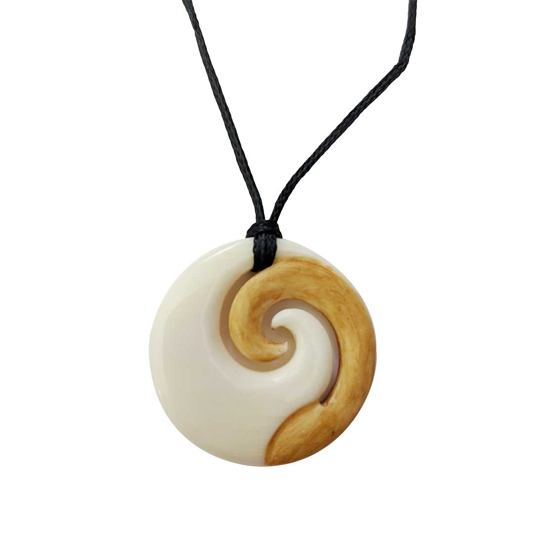 Bone Koru Pendant with a featured tea stain. Comes with a black cord.