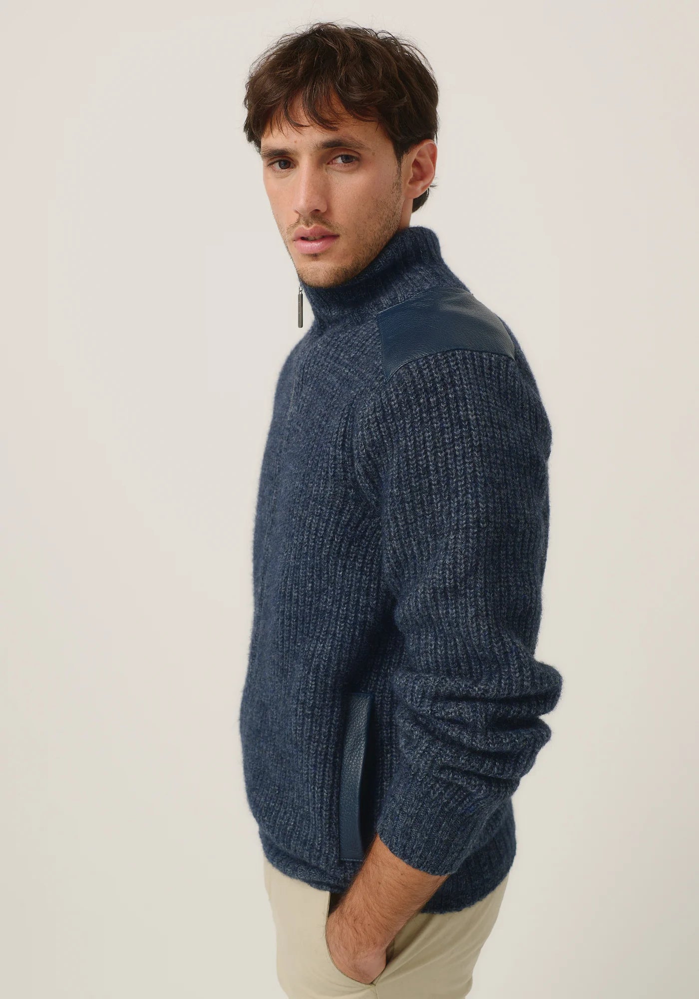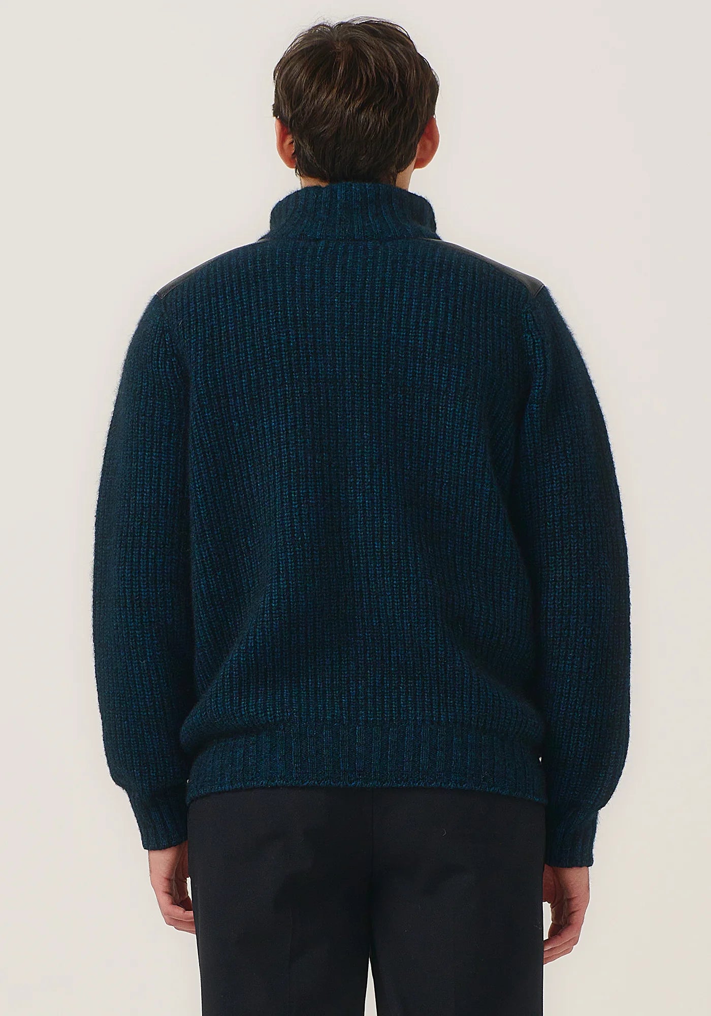 Fishermans rib knit structure with New Zealand deer leather patches stitched on the shoulders and welt pockets. This timeless piece will keep in your wardrobe for a lifetime.