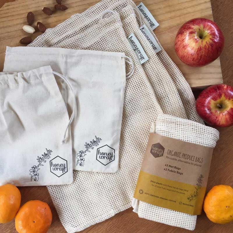 Ditch plastic with these handy bags ideal for all your fruit, veges and dry goods. Made from certified organic cotton, these bags are durable, washable, foldable, ideal for all kinds of produce as well as being great for the planet. The set contains 3 x net bags and 2 x fabric bags.
