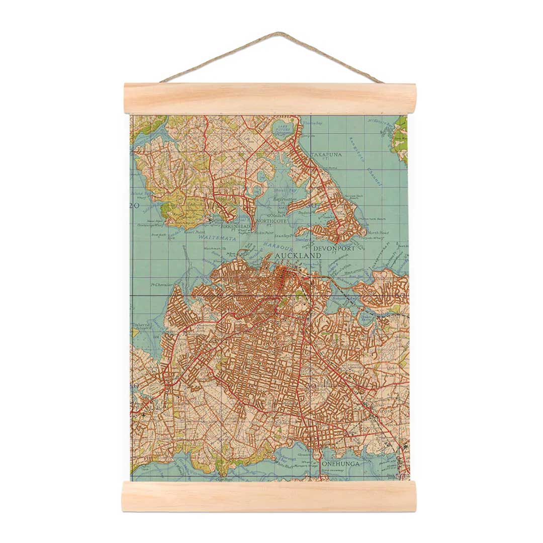 This Vintage Map of the Auckland is printed on A3 synthetic paper. With wooden batons top and bottom and a hemp twine, it is ready to hang.